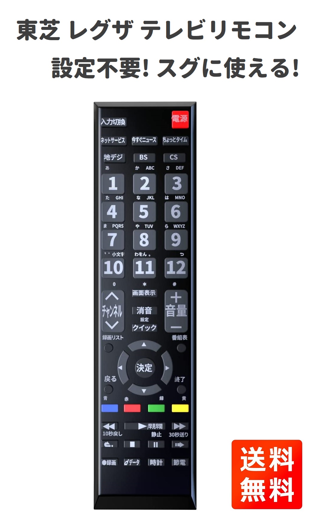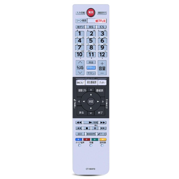 商品説明 ・東芝用「代用リモコン」です。 ・設定は不要で、電池を入れれば直ちに使用できます。 ・純正リモコンと同機能のボタンが設置されており、主な機能は全て使用できます。 ・タイムシフトボタンは非対応です。 ・電池は別売りです。 対応リモコン CT-90467 CT-90475 CT-90478 CT-90479 CT-90481 CT-90463 ※今すぐニュース ボタン非対応 CT-90471 ※ボイスボタン非対応 CT-90459 ※今すぐニュース ボタン非対応 HDMI4ゲーム ボタン非対応 (入力切換で操作できます) CT-90460 CT-90477 ※ボイスボタン非対応