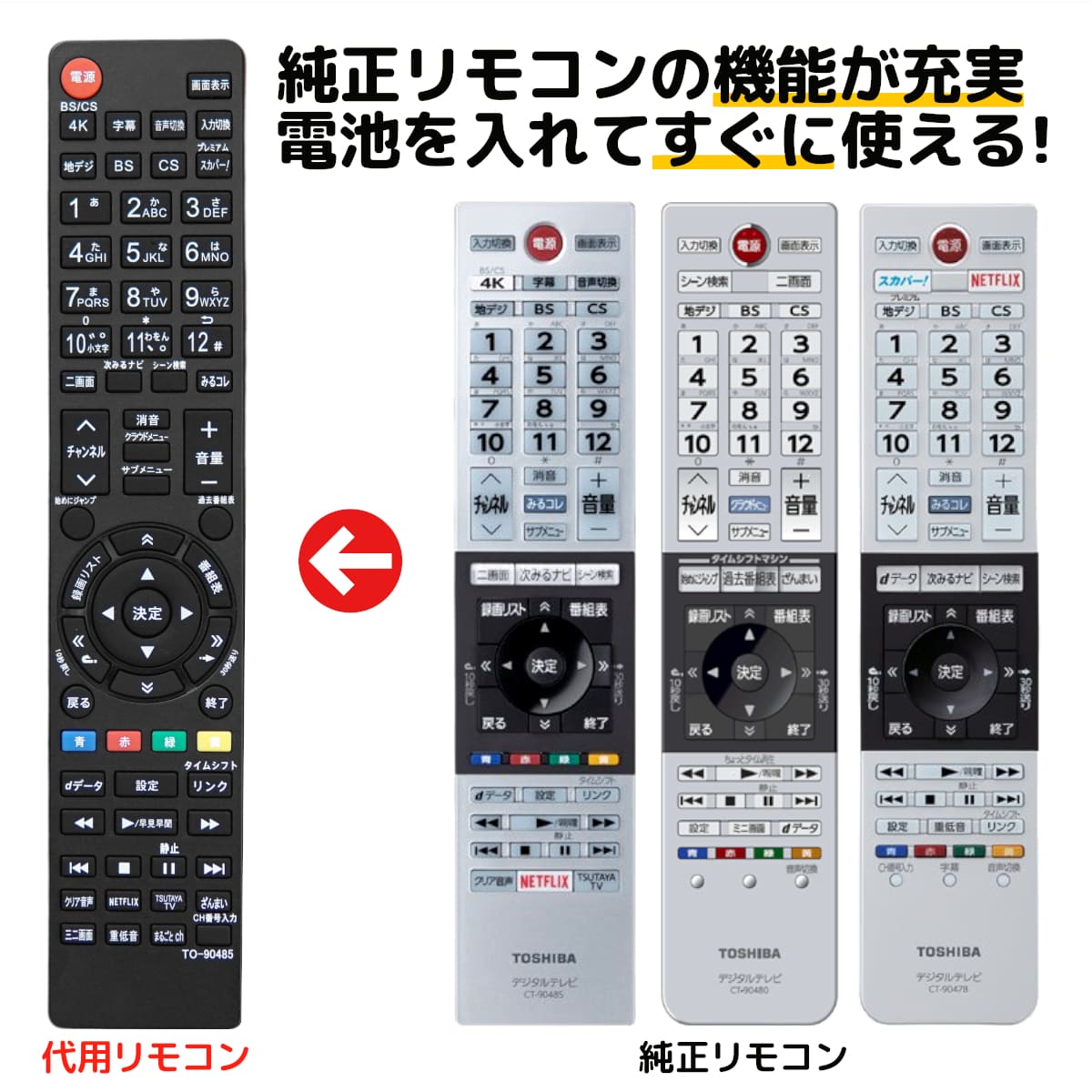 ・東芝テレビ用の「代用リモコン」です。 ・本リモコンの設定は不要です。電池を入れればすぐに使用できます。 ( 単4電池は別売りです。) ・純正リモコンとボタン配置は違いますが、主な機能は全て使用できます。 ・汎用、マルチリモコンでは使えない機能もご使用いただけます。 対応リモコン CT-90485 43M520X 50M520X 55M520X 65M520X CT-90477 50Z810X 58Z810X 65Z810X 55X910 65X910 CT-90477 50Z810X 58Z810X 65Z810X 55X910 65X910 ※ボイスボタン非対応 CT-90484 43BM620X 50BM620X 55BM620X CT-90478 49BZ710X 55BZ710X CT-90483 49Z720X 55Z720X 55X920 65X920 発送方法 ※送料無料。ネコポス(ポスト投函)での発送となります。追跡番号も付きますのでご安心ください。