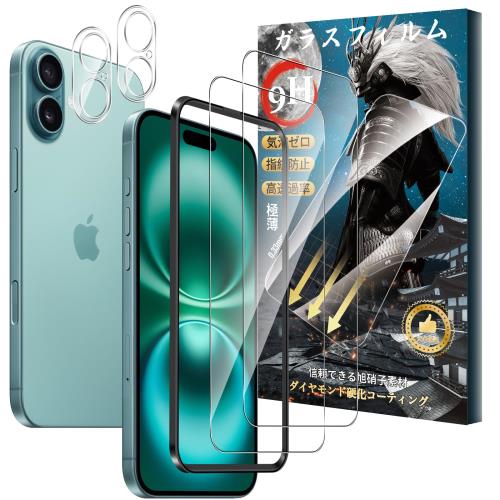 ■2+2枚セット対応 iPhone 16 Plus ガラスフィルム(2枚) + カメラフィルム(2枚) 硬度9H 強化ガラス 旭硝子製 疎水疎油 指紋・汚れ防止 Gree