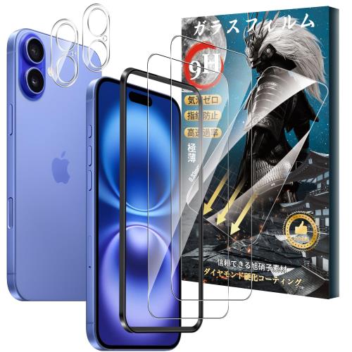 ■2+2枚セット対応 iPhone 16 ガラスフィルム(2枚) + カメラフィルム(2枚) 硬度9H 強化ガラス 旭硝子製 疎水疎油 指紋・汚れ防止 Greerass