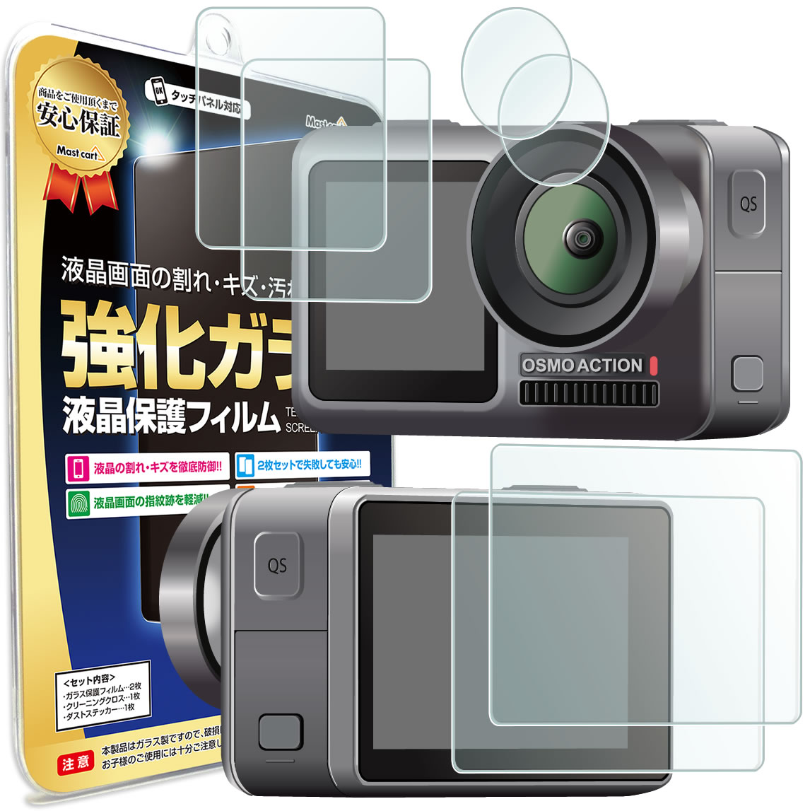 ●強化ガラス保護フィルム 6枚セットDJI OSMO Action 専用・メインディスプレイ2枚・サブディスプレイ2枚・カメラレンズ2枚液晶画面の汚れやキズを防止!本体を傷つけない!鮮やかな極薄光沢仕様。【90%の高透過率】液晶画面が映し出す本来の色合いを鮮やかに表現します。【指すべりが良く操作性が快適】液晶のタッチ操作も滑らかにタッチ操作可能です。【液晶画面の指紋跡を軽減】液晶をタッチする際の指紋は汚れとなって液晶に付着します。 指紋跡の付着を軽減し、鮮やかな画面を維持します。【キズに強いガラスフィルム】液晶本体へのキズを防ぐための強化ガラスを使用。【商品内容】・メインディスプレイ2枚・サブディスプレイ2枚・カメラレンズ2枚・マイクロファイバークロス 1枚