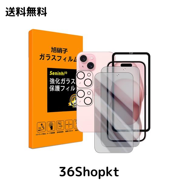 ■対応 iPhone 15 ガラスフイル のぞき見防止 【 iPhone15 フイルム(2枚入り) カメラフィルム(2枚入り) ガイド枠 】強化ガラス アイ