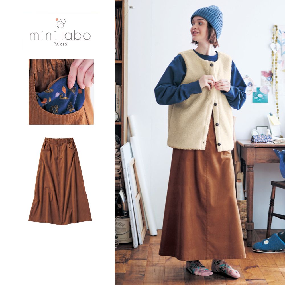 ーデザイン・スタイリングー・ほどよい厚みのコーデュロイ素材を使用した秋冬らしいスカート・裾が少し広がった女性らしいフレアシルエット・足さばきもgood・ウエストの前はすっきり、サイドから後ろはゴムでらくらく・ポケットの内生地は華やか & シックな花柄・後ろポケットがアクセントー素材ー・きれいめな細コーデュロイ素材・身生地はコットン100%使用でやわらかな風合いミニラボパリのデザイナーが生み出す大人かわいい世界「mini labo(ミニラボ)」は、パリで活躍する2人のクリエイター、キャロリーヌとセリーヌによるクリエイションブランド。パリの気分が詰まった、華やかで夢のあるミニラボワールドをつくりあげています。