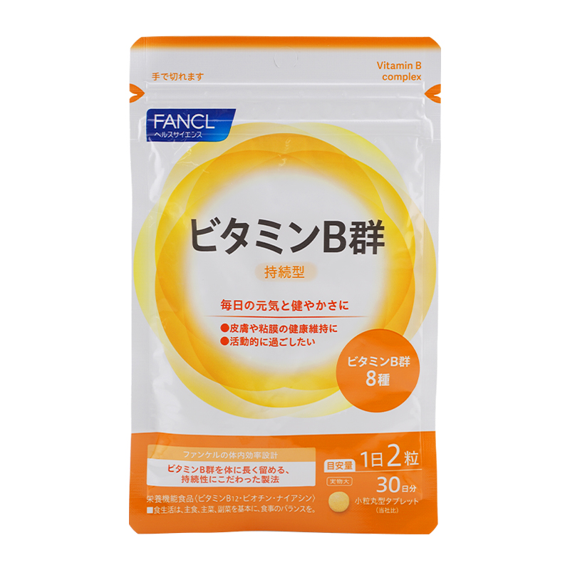 JAN 4908049491901 【商品説明】 協力して働く8種類のビタミンB群と働きを助けるイノシトールを配合。 水溶性で消耗しやすく、ストックできないビタミンB群。 ファンケルは吸収が穏やかで体内で長時間機能するようにロングタイム製法を採用。 長く働くから、1日2粒で効率よく補うことができます。 妊娠期におすすめな葉酸も400μg配合しています。 【1日の目安】 2粒 【主要成分/1日2粒当たり】 ビタミンB1:25.0mg、ビタミンB2:12.0mg、ナイアシン:30mg、ビタミンB6:10.0mg、 葉酸:400μg、ビタミンB12:20.0μg、ビオチン:50μg、パントテン酸:30.0mg、イノシトール:40mg 【栄養機能表示】 ビタミンB12は、赤血球の形成を助ける栄養素です。 ビオチン・ナイアシンは、皮膚や粘膜の健康維持を助ける栄養素です。 【アレルゲン(28品目中)】 該当なし