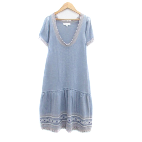 ■【中古】ジルスチュアート ニットワンピース Uネック 半袖 ミモレ丈 総柄 2 M 水色 ライトブルー /HO3 レディース