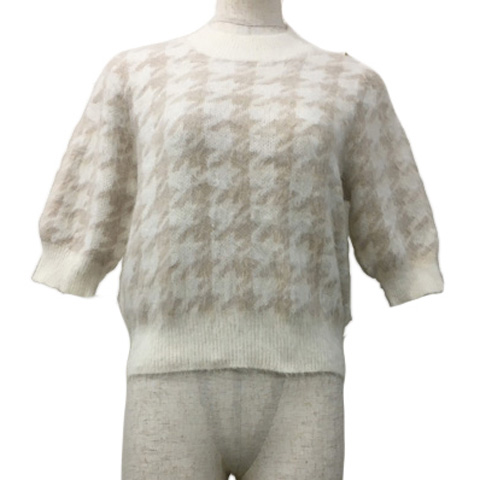 ■【中古】ジルスチュアート セーター ニット プルオーバー ハイネック シャギー アンゴラ混 総柄 五分袖 M ベージュ