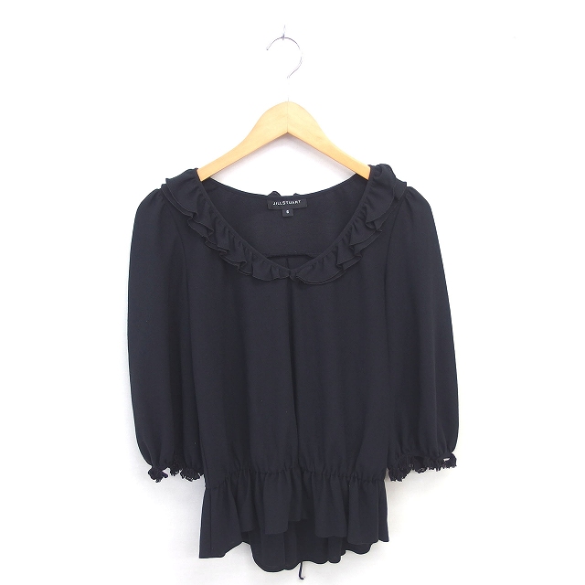 ■【中古】ジルスチュアート JILL STUART ブラウス カットソー フリルカラー レース リボン プルオーバー 七分袖 S 黒