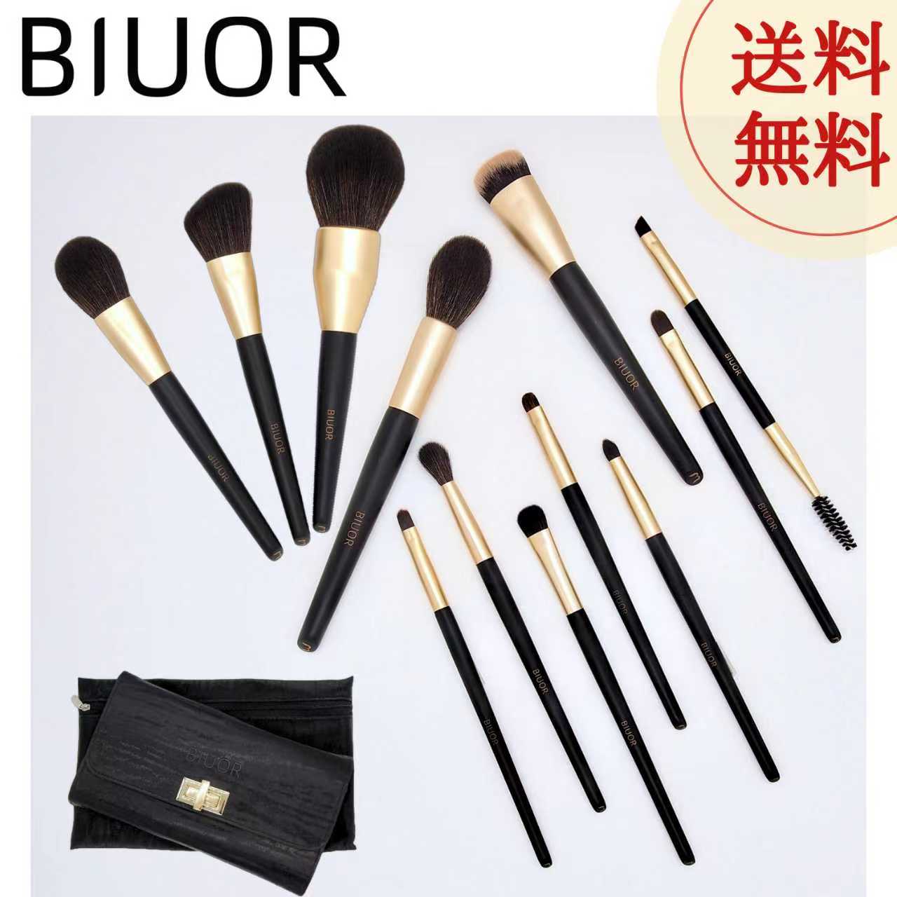 ■【送料無料】 BIUOR 豪華12本メイクブラシセット 天然毛 アイシャドウ 超買得 化粧筆 高級タクロン 天然毛 大毛量 超柔らかい 専用ポーチ