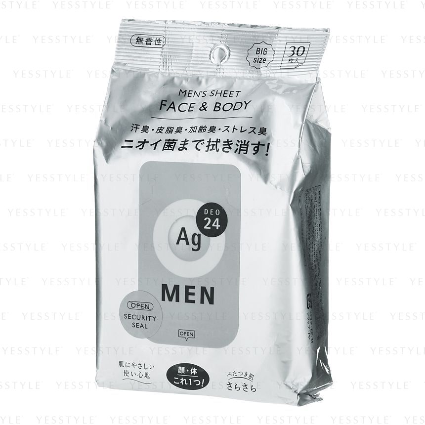 ■エージーデオ24メン メンズシート フェイス&ボディ 無香性(30枚入) 皮脂臭 加齢臭 デオドラント ヒアルロン酸 アロエエキス 全身爽快 ニ