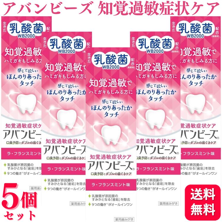 【5個セット】 わかもと製薬 薬用歯みがき アバンビーズ 知覚過敏症状ケア 80g 歯磨き 歯みがき 歯磨き粉 おすすめ ランキング デンタルケア 知覚過敏 歯周病 敏感歯 乳酸菌 薬用 歯みがき はみがき 歯垢 ミント シトラスミント 送料無料 ・清掃剤として生きた乳酸菌WB2000を配合・刺激バリア作用で神経への伝達経路を塞ぎます(乳酸アルミニウム)・ほんのりあったかクリームペーストで刺激に敏感な方の歯磨きのみがき心地をやさしく和らげます