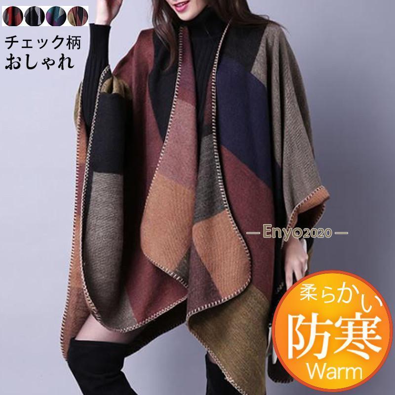 ストール レディース 大判 ポンチョ マントコート マフラー ケープ ショール 配色 チェック柄 防寒 暖か ふんわり 秋冬 オフィス おしゃれ 上品