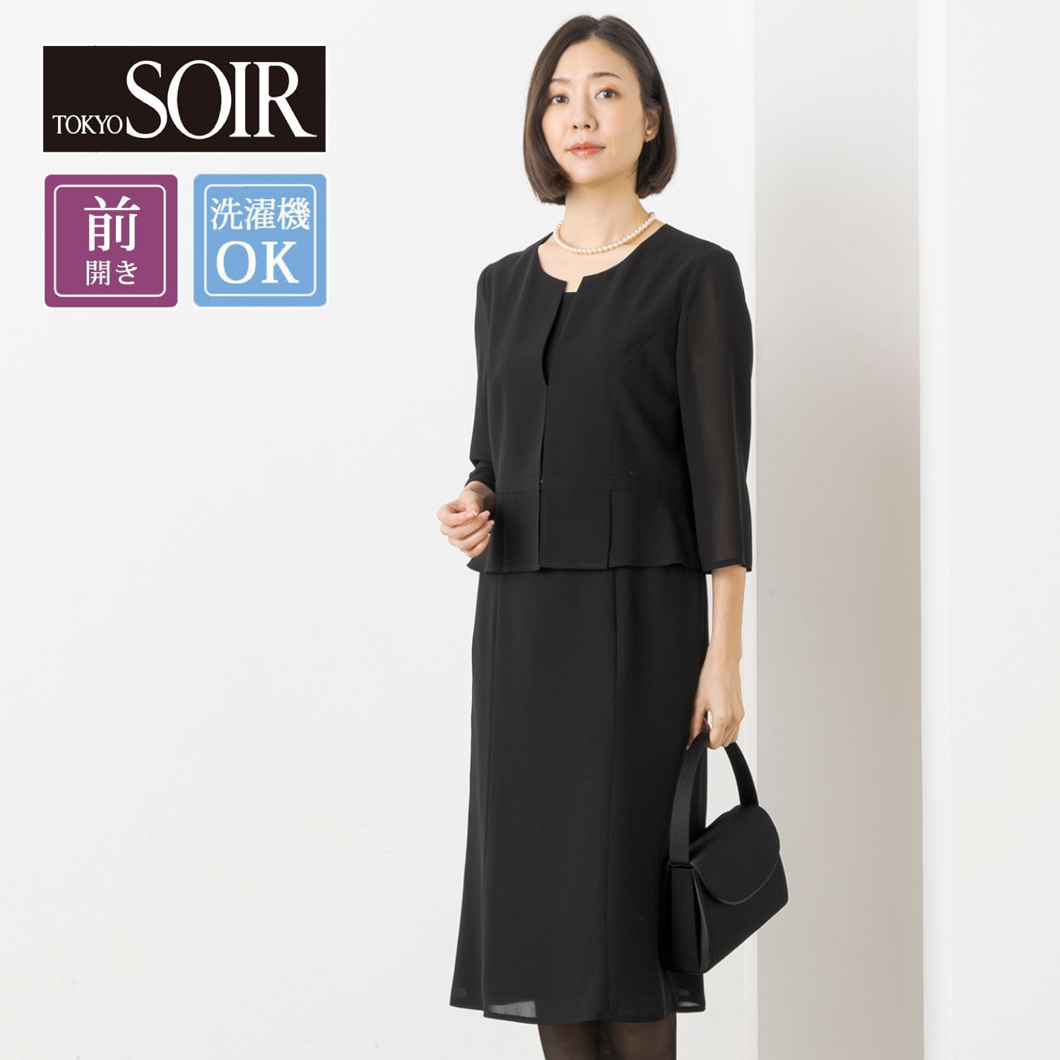 【2点セット】ジャケット/セパレート風ワンピース▼ジャケット・凛とした漆黒のジャケット・少し立ち上がったスタイリッシュなスタンドカラー・さり気ないアクセントを添えるフェイクボタン・フロントは2箇所のカギホック留め・年代を問わず長く愛用できるシンプルなデザイン・季節を問わず着られるので、いざという時に重宝▼セパレート風ワンピース・ジャケットを羽織っているようなデザイン・脱ぎ着がしやすいフロントオープンタイプ・エレガントな印象を演出するフレアシルエット・年代を問わず長く愛用できるシンプルなデザイン・季節を問わず着られるので、いざという時に重宝―スタッフ着用コメントー・ワンピースは全体的に細身なサイズ感です。特にバストとヒップが少し窮屈に感じました。グラマーな方はワンサイズ上をおすすめします。・ワンピースのウエスト部分が細身な作りとなっているので、着脱時にはお化粧などにご注意ください。(今回着用:9ARサイズ、身長:149cm、体型:普通、普段着用:Mサイズ)-----------伸縮性:なし生地の厚さ:普通質感:さらっとしているサイズ感:ややタイト推奨季節:春夏秋冬-----------東京ソワール/TOKYO SOIRブラックフォーマルは東京ソワールから生まれました。1969年に『株式会社東京ソワール』となり、日本で初めて和服に変わる喪服(ブラックフォーマル)を開発。数あるフォーマルメーカーの中で唯一、オートクチュールからスタートした会社です。フォーマルウエアのリーディングカンパニーとして全国47都道府県に有名デパートやスーパーなどに合計 約1100店舗に展