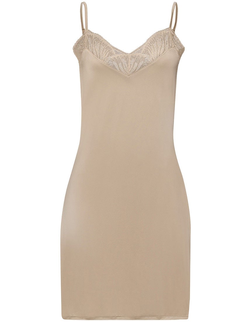 アール・ヌーヴォーを代表する画家である「アルフォンス・ミュシャ」の作品からインスピレーションを得たコレクション。ミュシャの作風に見られる透明感のある色彩をオンプリント手法で表現し、ゴージャスながらも軽やかな印象に。●しなやかになじむ着ごこち 上品な光沢感のあるスムース素材を使用・胸もとのレースとアップリケには刺繍の柄に合わせたプリントレースを使用・胸もとのレースとアップリケにはラメ糸を使用・アップリケはバラの花をイメージ上品な透け感のあるレースとシンプルでなめらかな素材の組み合わせがエレガントなスリップ。胸もとには鮮やかな花々をあしらいました。アンダーバスト部分から脇へとまとうように飾ったゴージャスなアップリケは美しいバラの花がモチーフ。自由でしなやかなレースデザインが優雅な印象を与えます。裾はゆるやかな曲線を描くアシンメトリーなカッティングに。オリエンタルな雰囲気と気品が漂う一枚です。