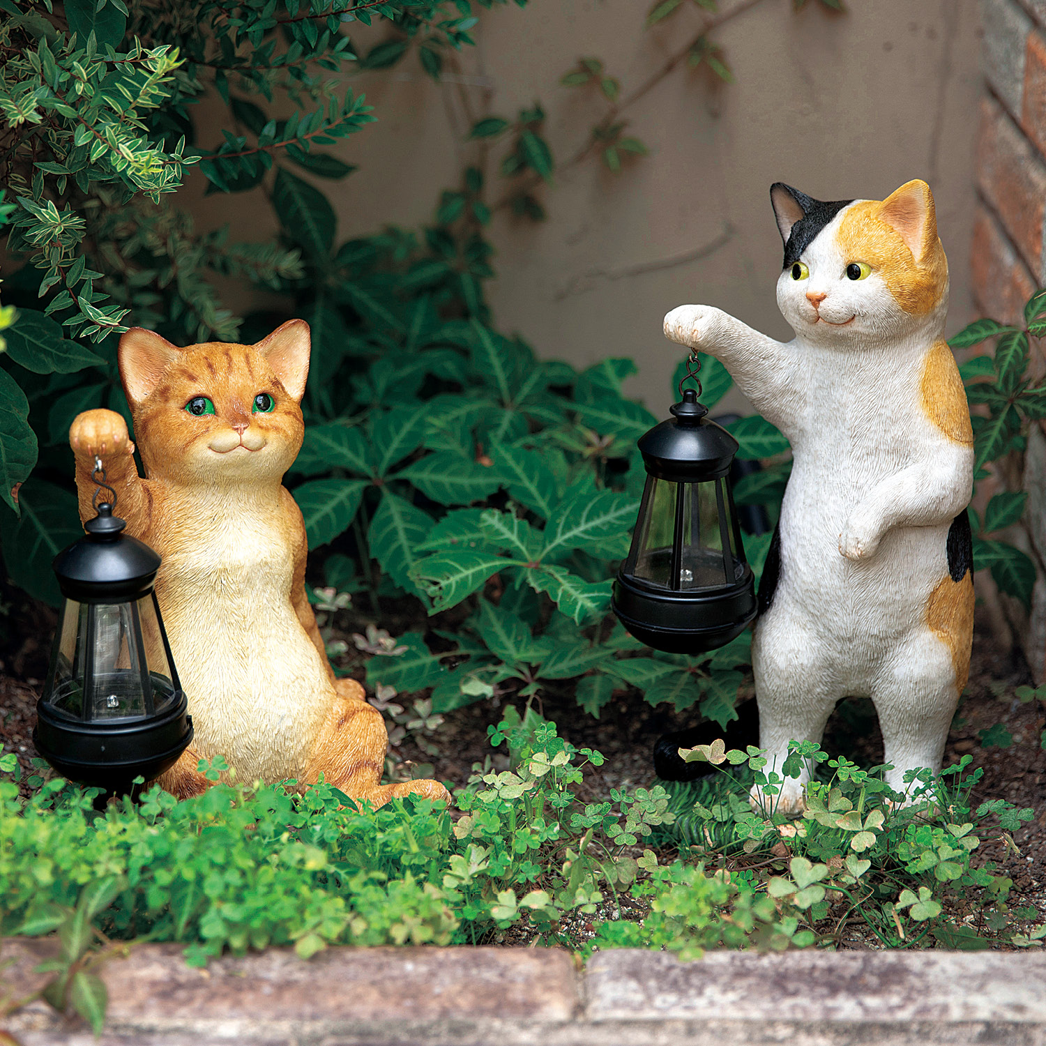 ユーモラスな表情が可愛い猫のオーナメント光センサー付きの自動点灯で、暗くなるとランタンの灯りがともります太陽光充電式だから電気代いらずコードレスで置き場所を選びませんLEDライトはやさしい灯りのイエロー球を使用