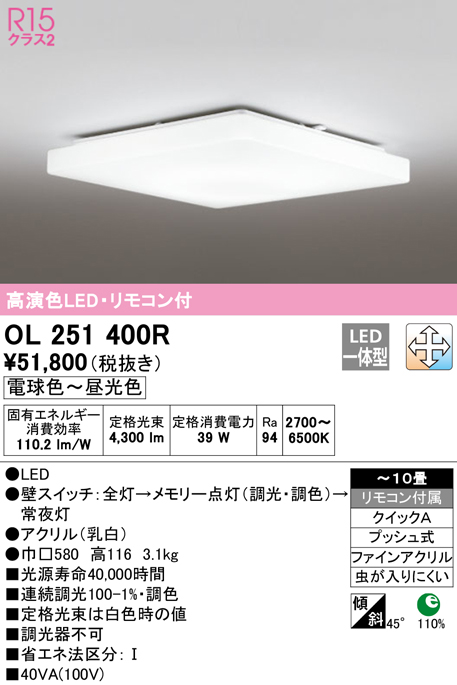 ◆メーカー:オーデリック ◆品名:シーリングライト LED一体型 電球色〜昼光色 調光・調色 ◆品番:OL251400R ◆器具光束(lm):4000〜5000 ・商品スペックについては商品画像をご参照くださいませ。 ◆沖縄県は配送不可となります。ご了承下さい。 ※「発送先が北海道・沖縄・離島地域」に該当するお客様は別途送料がかかる場合がございます。 システムの都合上、ご注文時には送料が加算されておりませんが、 ご注文完了後に当店よりメールにて追加送料の承諾が取れてから手配を進めさせていただきます。 「発送先が北海道・沖縄・離島地域」に該当するお客様で ご注文前に送料を知りたい方はお問い合わせいただけましたらご案内いたしますので、 お気軽にお申し付けください。