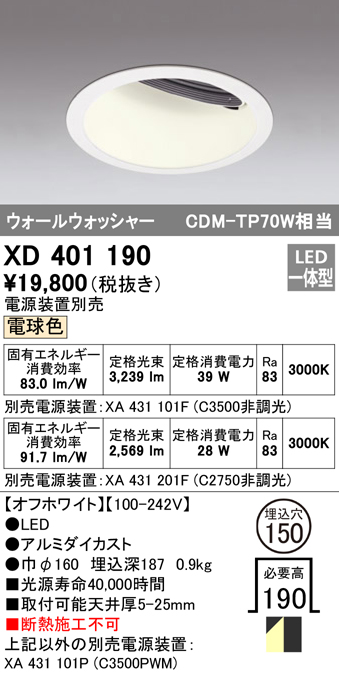◆メーカー:オーデリック ◆品名:ダウンライト LED一体型 電球色 M形(一般形) ◆品番:XD401190 ◆器具光束(lm):3000〜4000 ・商品スペックについては商品画像をご参照くださいませ。 ◆沖縄県は配送不可となります。ご了承下さい。 ※「発送先が北海道・沖縄・離島地域」に該当するお客様は別途送料がかかる場合がございます。 システムの都合上、ご注文時には送料が加算されておりませんが、 ご注文完了後に当店よりメールにて追加送料の承諾が取れてから手配を進めさせていただきます。 「発送先が北海道・沖縄・離島地域」に該当するお客様で ご注文前に送料を知りたい方はお問い合わせいただけましたらご案内いたしますので、 お気軽にお申し付けください。