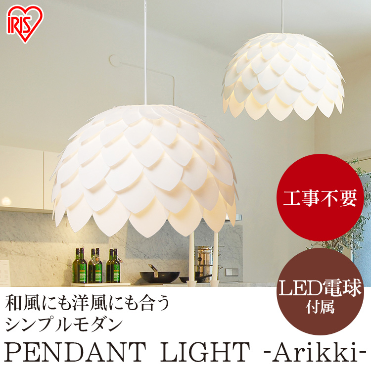 お部屋に合わせて選べる、シェードと器具とLED電球をセットにしたデザインペンダントライト Arikki(アッキ)シリーズです。和風にも洋風にも合う北欧風のシンプルでモダンなデザインです。取り付け工事が不要で、今お使いの照明器具からの付け替えが簡単です(コード調節も簡単に行うことができます)。付属のLED電球は60W相当の広配光タイプで、暖かみのある電球色です。