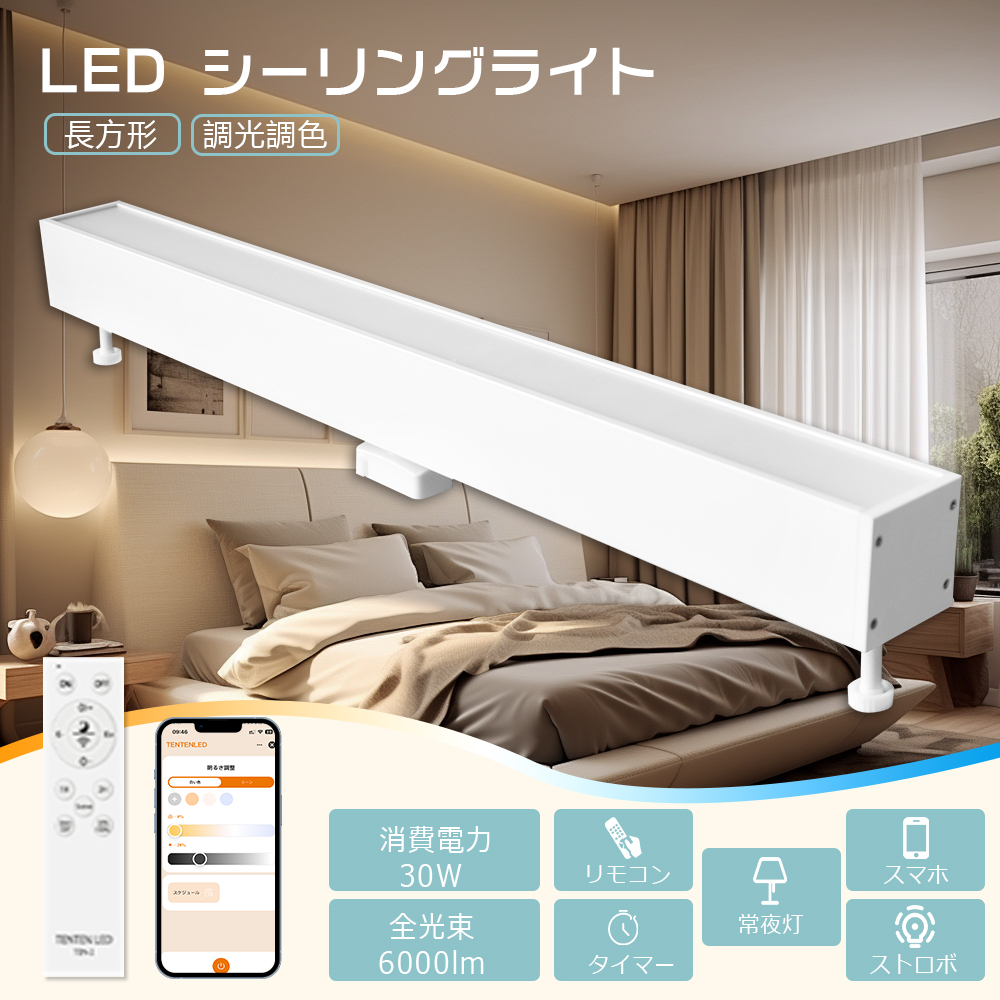 ■LEDシーリングライト 長方形 調光調色 30W シーリングライト 直管形 スマートライト スマホ操作 ダクトレール 照明 PSE認証 リモコン付き