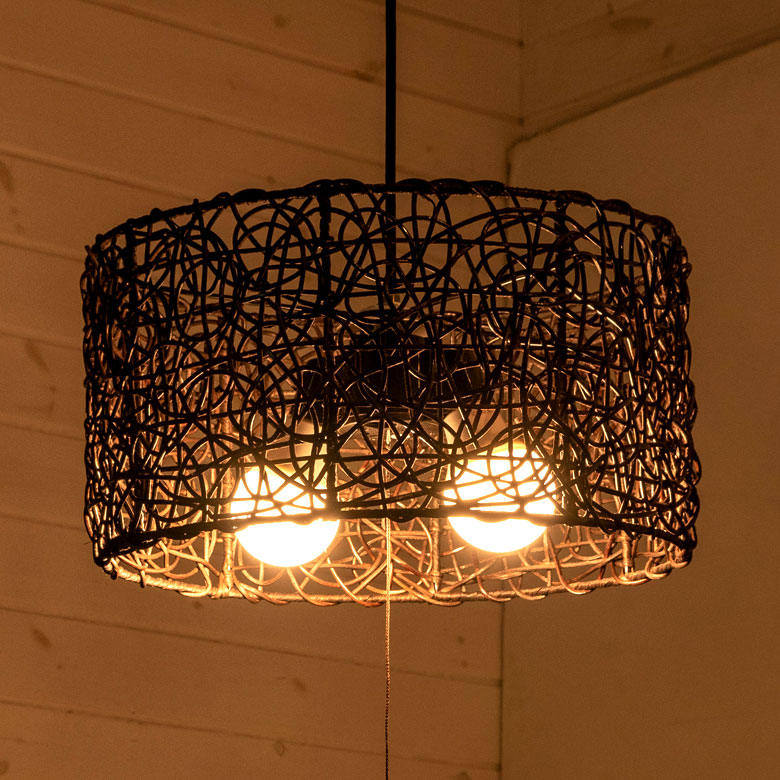 丈夫なラタン(籐)素材を活かし、スチールの骨格に合わせてぐるぐると組み上げた、職人の技術が光る逸品。ラタンの編み目から溢れる陰影が、情緒あふれるアジアン空間を演出します。深みのある落ち着いた風合いは、アジアンリゾートのインテリアはもちろん、和風、モダンな空間など幅広い空間にマッチします。バリ島の夜を思わせる優しい灯りで、癒しのひと時を。■サイズ(cm):約 W 40 × D 40 × H 22※多少サイズは前後します。■重量:約 1kg■素材:ラタン、スチールフレーム■生産国:バリ(インドネシア)■付属品:2灯ペンダント用ソケットケーブル(長さ約0.5m) 引掛シーリングタイプ■備考:・電球:口金E26サイズ(2個ご用意ください)ソケットはPSEマーク取得済・豆電球:口金E12サイズ※100Wまで。※熱くならないLED電球を推奨します。※電球は別売りです。・コード:長さ約50cm、プルスイッチ付き■ご注意:商品ページ内「ご注意」をご覧ください。