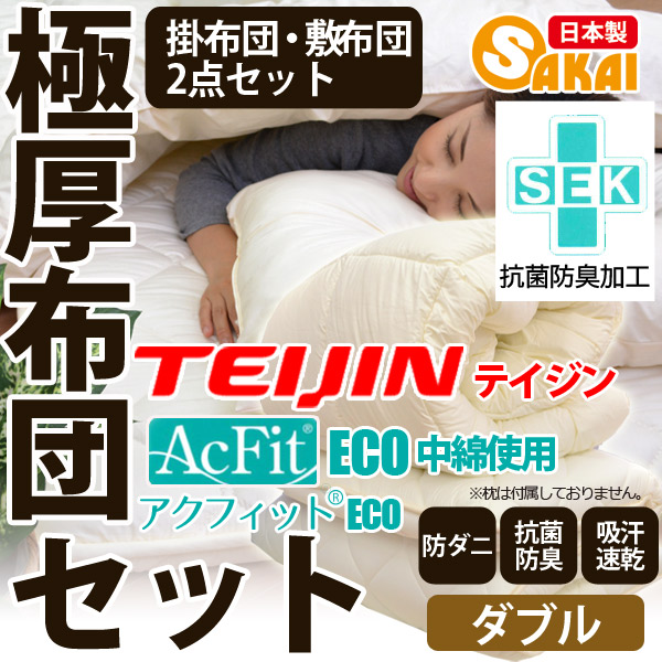 ■日本製 布団セット 2点セット無地 掛布団・敷布団 布団セット ダブルサイズ 防ダニ 抗菌 防臭 吸汗 速乾加工 アクフィット中綿使用