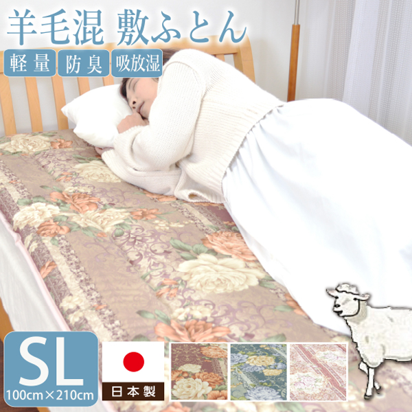 ■【日本製】呼吸する 敷布団 羊毛 50% 固綿 3層 シングル 100×210cm 軽い ウール 羊毛 吸湿 放湿 体圧分散 固綿使用 高機能 上質素材 腰