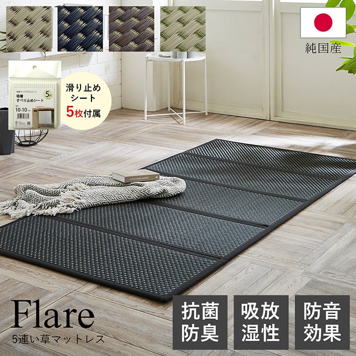 セット内容 フレアマットレス1枚 + 吸着滑り止めシート(5枚入り)サイズ 120×210cm セミダブルカラー ベージュ/ブラック/ブラウン/グリーン組成 表地=い草(九州産)※普通織、青森ヒバ加工裏地=不織布10mm製品重量=約2.7kg厚み=約1.4cm原産国 日本製(純国産)洗濯表示 不可【商品説明】使わない時は折りたたんで収納OK●フローリングの部屋に敷布団を置く際には、い草のマットレスをご一緒に●敷布団の下に敷くだけで、い草が吸放湿性を発揮し快適●ごろ寝マットとしても使え、何枚かつなげてラグとして使ってもOKです●和室のないお宅で赤ちゃんを寝かせる時や、来客時にお部屋の一部に和のスペースを作るなどさまざまなシーンに便利●ヒバエッセンスと、い草の持つ抗菌防臭機能でいつも清潔●3つ折りでコンパクトにたたんで隙間にしまえます●い草1本1本がふとくてしっかりとした日本製