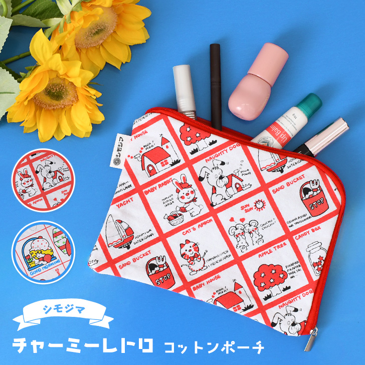 ■新作 チャーミーレトロシモジマコットンポーチ 小物入れ おしゃれ 大きめ マチなし 可愛い ファスナー l字 旅行 綿 小物ポーチ 化粧ポー