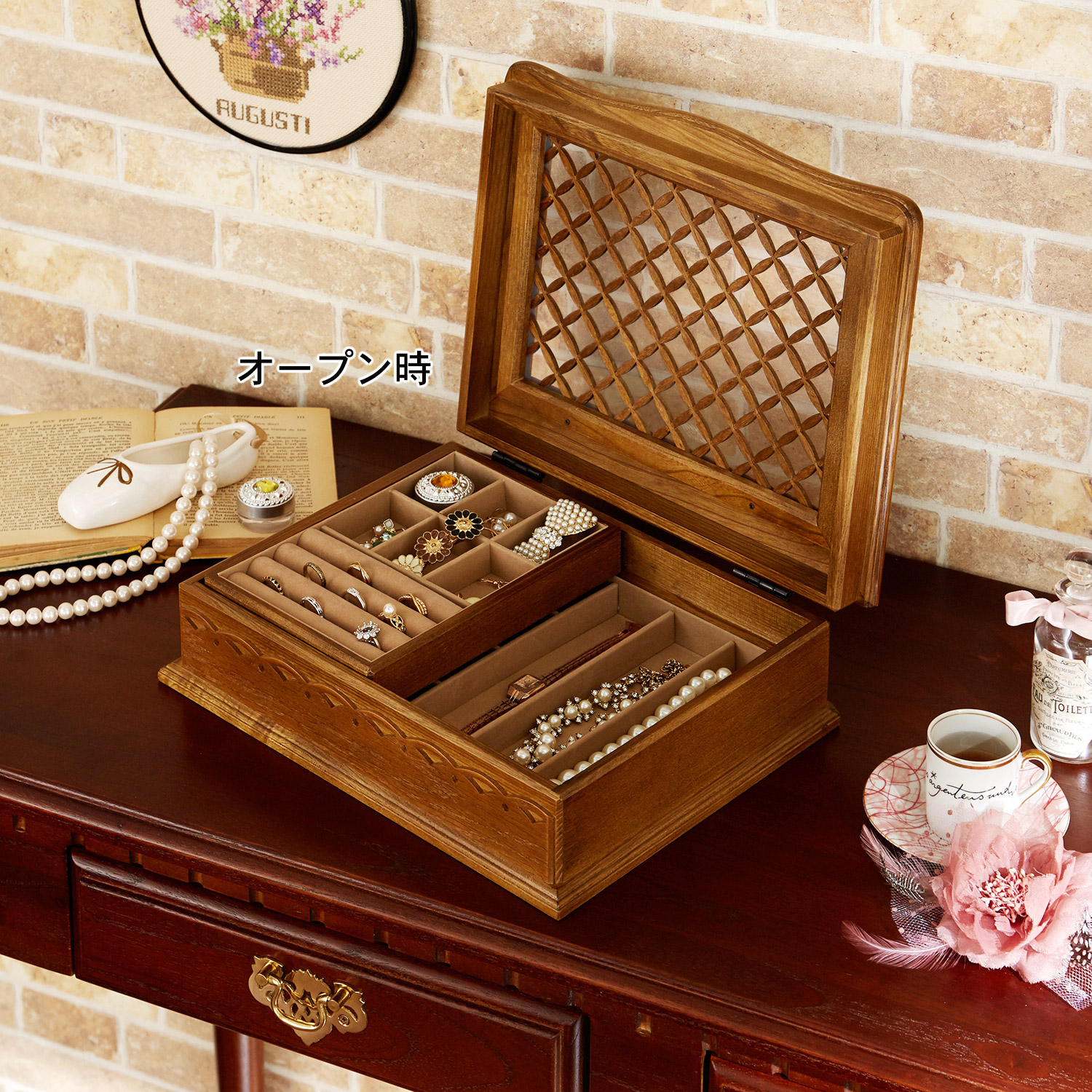 美しい天然木の質感とアンティーク調の繊細なデザインから上質感がただよう逸品「パリの雑貨屋」シリーズより、天然木・栓(セン)やナラ材の突板を取り入れ、国内で職人がひとつひとつ丁寧に手作りしたジュエリーケースですガラスを配したフタ部分には、ジュエリーがディスプレイとしてさりげなく映えるよう飾り格子を、また前板には細やかなレースモチーフをあしらいました優美な曲線を描くフタを開けた内側は、指輪やイヤリング、ネックレスや腕時計などを細かく分けて収納できるスペース取り外せる仕切り付きです美しい木目がナチュラルテイストやカントリー調のインテリアによく合い、置いておくだけで上質な空間を演出します