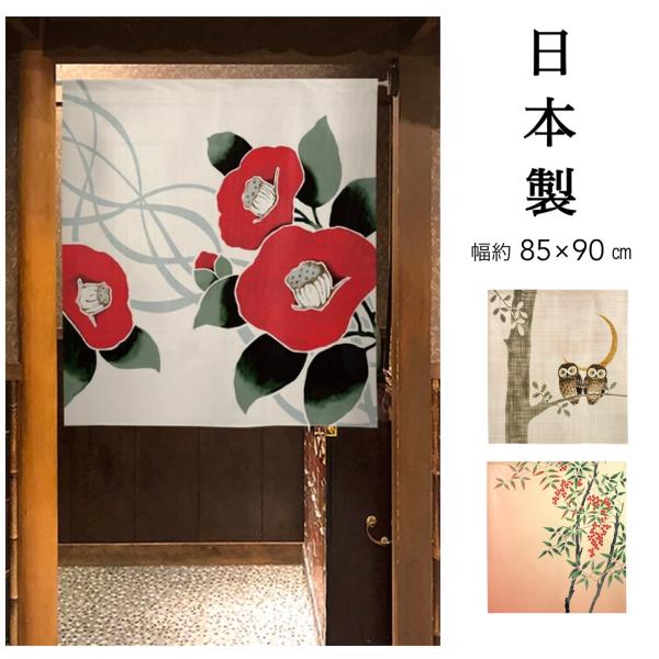 ■のれん 中丈 目隠し 間仕切りカーテン 和風 和 椿 ふくろう 南天 縁起物 幅85×丈90cm 日本製 送料無料