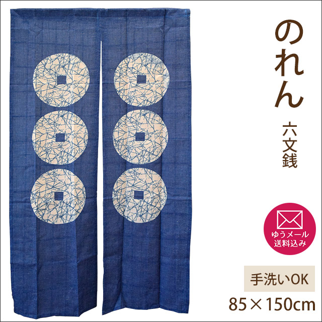 ■【ゆうメール 送料無料】のれん 六文銭 約85×150cm 手洗いOK ( 麻混 麻 和 和柄 和風 仕切り )【代引不可・同梱不可・日時指定不可】