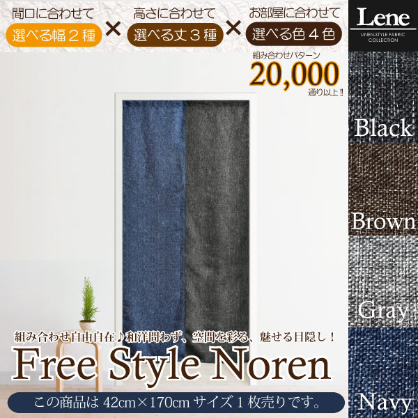 サイズ:約42cm×170cm(一部手作業のためサイズに若干の誤差があります)カラー:ブラック・ブラウン・グレー・ネイビー素材:ポリエステル100%生産国:中国製ナチュラルテイストの和洋問わずお使い頂ける、リネン風生地 リーネ 上品で柔らかな印象の組み合わせのれんです。約20,000通り以上の組み合わせが出来るフリースタイルのれんです。 ■ご注文に際しての注意掲載している商品画像は、実際の色味を再現できるよう調整しておりますが、ご覧頂いておりますPCモニタ・携帯端末の画面等の環境や、実際に敷くお部屋の照明等の光加減に左右されますので、予めご了承の上ご注文くださいますようお願い致します。■メール便送料無料について■【メール便送料無料をご希望の場合】★決済方法は前払いのみ