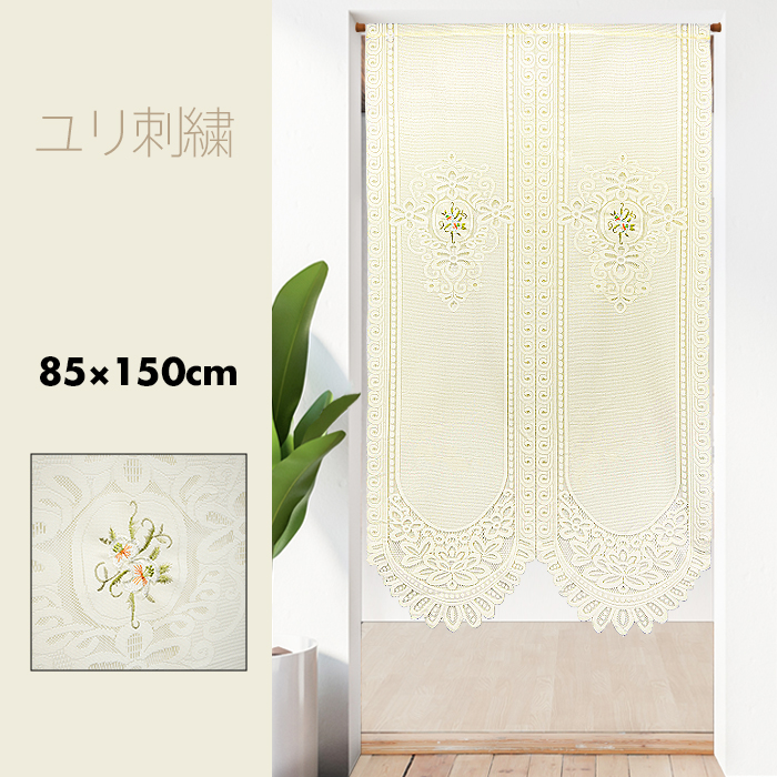 ■のれん おしゃれ カーテン 間仕切り 目隠し ナチュラル フラワー 北欧 エレガント ロマンチック ユリ刺繍 85×150cm