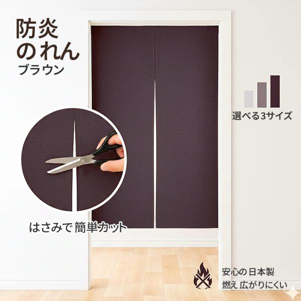 ■防炎 のれん 90cm丈 ブラウン 間仕切り 目隠し 安心の日本製 カットライン付き 洗える 無地 暖簾 おしゃれ