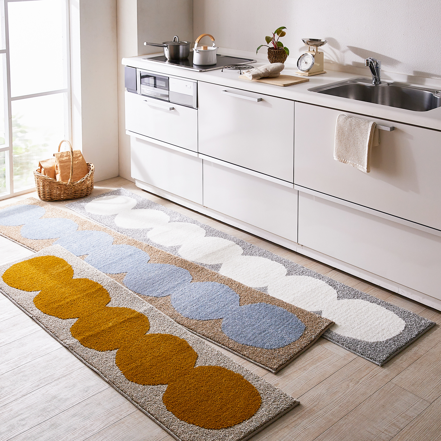 ―デザイン・スタイリング―・お団子が並んでいるような、シンプルかつ飽きのこない大胆なデザインのキッチンマット・サイズ展開でお団子が増えていくデザインです・くすんだカラーで無地ライクなのでどんなインテリアにもなじみやすいです・シンプルですっきりとした印象のアイボリー、くすみカラーがおしゃれなブルー、ビンテージテイストのお部屋にもぴったりなマスタードの3色展開です―素材―・ふんわりと柔らかな足ざわりで、通年使えますー機能ー・裏面にすべりにくい加工が施されているので、ずれが気になりにくいタイプ。掃除機をかけるときもずれが気になりにくいです・床暖房、ホットカーペット対応なので、肌寒い時期にも使えます