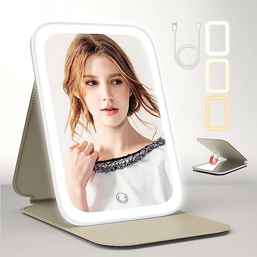 ■Tekstap ライト付きミラー、革のケース メイク 鏡 ライト付き、持ち運びに便利 折りたたみミラー LED 化粧鏡、3色モード 明るさ調節可能