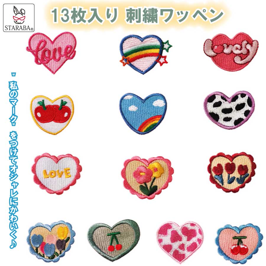 ■13枚入り 刺繍ワッペン アップリケ アイロン 刺しゅうパッチ かわいい ハート 保育園 幼稚園 補修パッチ 膝補修 肘補修 縫い付け 洋服