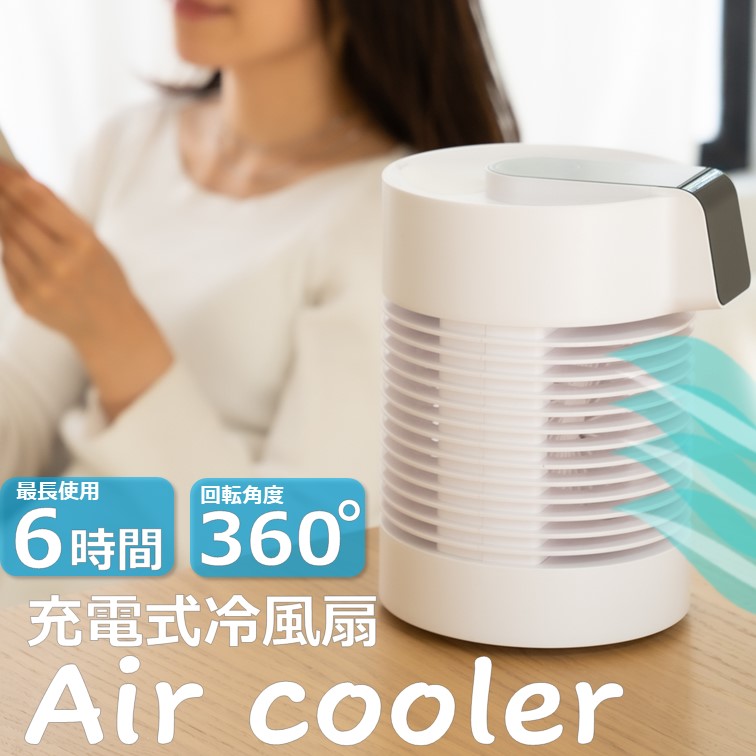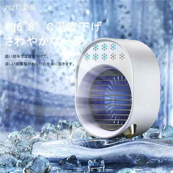 USBで動く冷風扇2021年バージョン!水の気化熱で冷やす卓上エアコン!マイクーラー!超音波加湿器の技術を応用し、ミストをファンで送風する新システム!フィルターレスでお手入れもラクラク♪更に!充電式で最長約6時間、電源なしで使用可能!卓上サイズで持ち運びも便利です!【接続次第で使い方広がる!】パソコンやUSB機器につないで、オフィスやデスクでパーソナルに使ってもOK!携帯型充電池につないで屋外のBBQやアウトドア、レジャーやキャンプなど持ち運びで使ってもOK!運動会や体育祭などでも活躍します♪充電器(ACアダプター)とつなげばコンセントでも使えるので、ご高齢の方やお子様など、エアコンが苦手な方にもお使いいただけます。更に、ミストの力でひんやり効果がパワーアップ!涼しい風をお届けします!【機能】風量は3段階、強・中・弱が選べます。【使い方】タンクに水を入れてスイッチを入れるだけ。水を吸ったフィルターに扇風機の風を送ることで、空気が水で冷却され、気化熱効果で涼しい風となります。重さ:1kg