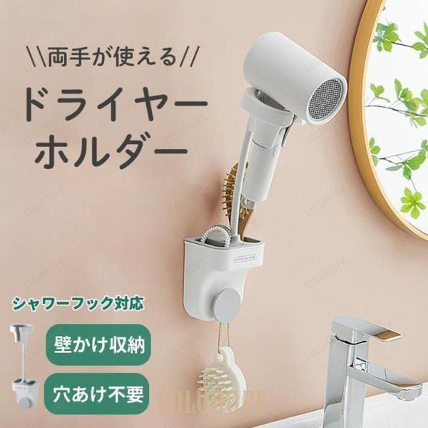 ドライヤー ホルダー 収納付き ハンズフリー 吊り下げ 浮かせる 収納 スリム スタイリッシュ 壁掛け 強力粘着 スタンド 穴開け不要 時短 便利グッズ グレー