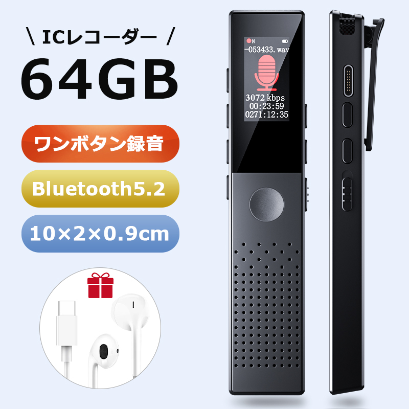 ■ボイスレコーダー icレコーダー 64GB 録音機 ワンボタン録音 大容量 ブルートゥース通話自動録音 軽量 遠距離録音 ノイズキャンセル 音声