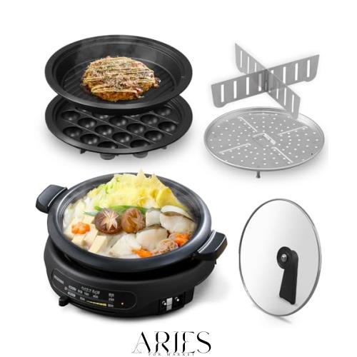 ■[東京DECO] 電気鍋 グリル鍋 3枚プレート (深なべ・グリル・たこ焼) 深型 深さ7.5CM 脱着式 ガラス蓋 [3~4人用 3枚プレート] [深なべ・グ