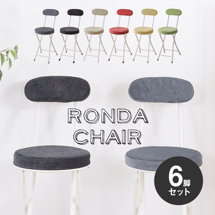 【お得な同色6脚セットです】 ころんとした丸い座面と豊富なカラーバリエーションが魅力の折りたたみチェア。 ボリュームのある厚めの座面がしっかりとした座り心地の折りたたみチェア「RONDAロンダ」。 表情豊かなベロアのような起毛した生地とホワイトスチールの脚がおしゃれ。コンパクトなサイズ感なので、キッチンや玄関など限られたスペースでも活躍します。使わないときはワンアクションで折りたたんで、隙間などに収納できます。 カラーはダークグレー、スモークブラック、ベージュ、レッド、イエロー、グリーンの6色をご用意。シンプルに、シックに、ポップに、インテリアやシーンに合わせてお選びください。 【商品詳細】 約幅30cm×奥行47cm×高さ74cm (座面高:約47cm) ※折りたたみ時:約幅30cm×奥行7cm×高さ85cm 梱包サイズ:幅92cm×奥行38cm×高さ32cm 商品重量:約2.5kg スチール(粉体塗装) ポリエステル 品番:PC-32