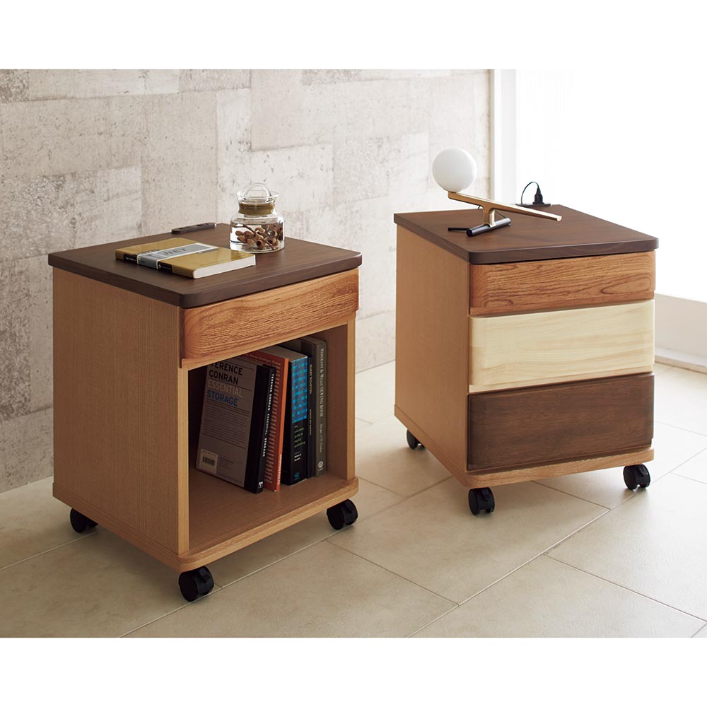 引き出し前板にアルダー、ポプラ、ウォルナット天然木無垢材を贅沢に使用したナイトテーブル。品よく佇む丁度いいサイズ感で、ベッド横にはもちろん、ソファの横やダイニングテーブル下にもおすすめ。日本の熟練の家具職人がひとつずつ丁寧に仕上げたワンランク上のナイトチェストです。
