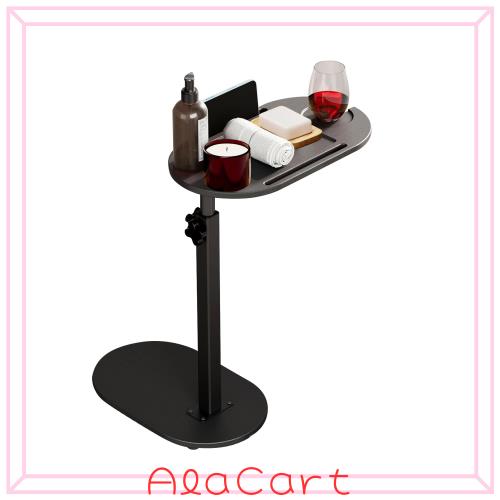 ◆商品名:サイドテーブル 昇降式 木製 ワイングラスホルダー付き ベッドサイドテーブル 360度回転 防水 収納 高さ調節可能 ソファ横 テーブル 浴室