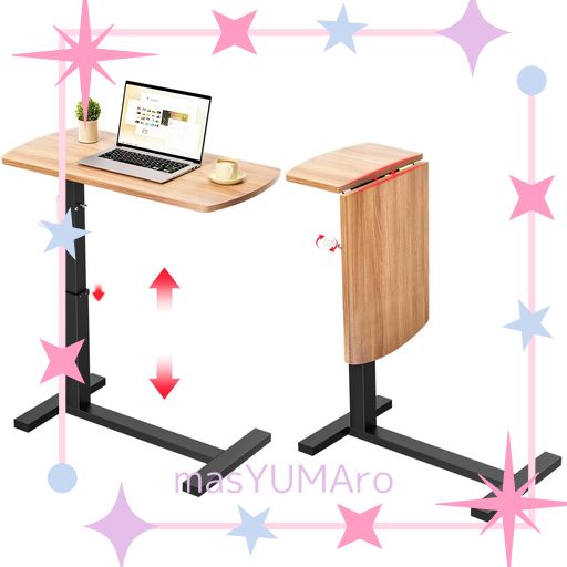 ■サイドテーブル 昇降式デスク高さ64-93.2CM 在宅ワーク PCデスク幅80CM 高さ無段階調節 介護用 ベッドテーブル (折畳み, 木の色)