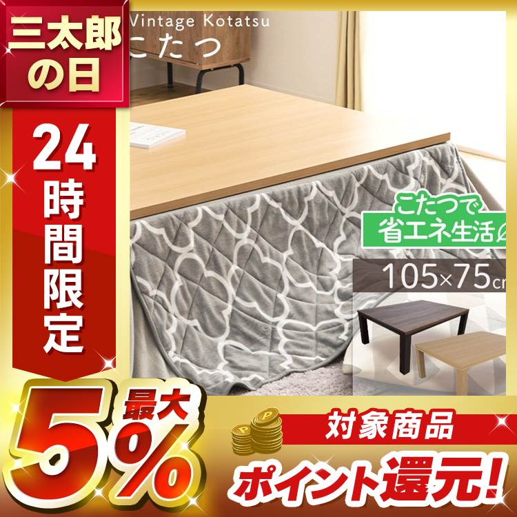 スタイリッシュなヴィンテージ感溢れた木目調こたつです。 芯から暖まるU字型石英管ヒーター300Wで体を芯からポカポカ温めます。 温度を一定に保つサーモスタットと温度の過上昇を防ぐ温度ヒューズ付き。 ※こたつ布団は別売りです。 ※当商品はお取り寄せ品の為、在庫の確認及び商品のお届けまでお時間を頂く場合がございます。 また、商品がメーカーにて完売となっていた場合、キャンセル又は注文内容の変更をお願いいたしております。 予めご了承くださいますようお願いいたします。