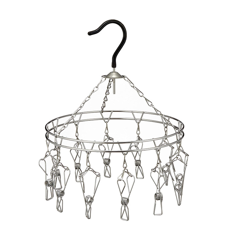 サイズ:直径26×H31cm材質:ステンレス鋼ピンチ数:12生産国:台湾丈夫で錆びにくく、デザインもシンプルなステンレスハンガー。従来のハンガーは開くとき、ピンチがからまりやすく不便でしたが、ピンチをつるす鎖を工夫することで、この問題が解決されています。ステンレス鋼を使用することで、太陽の光で劣化することがなく、屋外につるしたまま使用しても、長期間美しさが保たれます。ピンチは1本の線材で作られていますので、耐久性に優れています。線材の両端を溶接することで、鎖が取れにくく、握り手も安定します。ピンチに凹凸がないので、衣類を傷めることがありません。