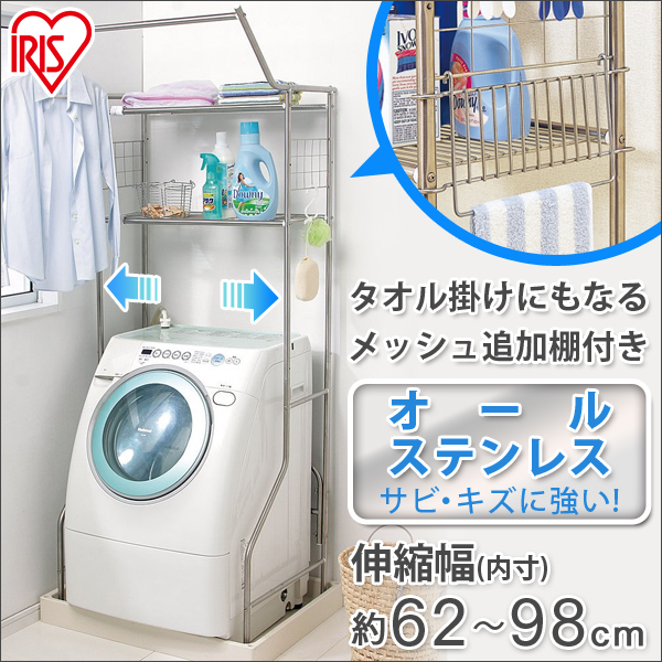 軽くてサビ・キズに強いオールステンレス製!洗濯機周りの小物の整理に最適☆幅は67〜103cmまで伸縮可能!2層式洗濯機にも対応!仮干しする際に便利なハンガーバーが付☆メッシュ棚とメッシュパネル付!