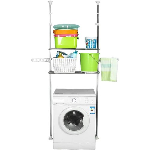 BAOYOUNI つっぱり棚 洗濯機ラック ランドリーラック2段 天井の梁や床の段差があっても設置できる 突っ張り式ラック ハンガーバー付属 ホワイト