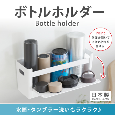 マイボトルやタンブラーなどをスッキリ収納できる、ボトルホルダーです。シンプルなホワイトのカラーで清潔感のあるホルダーです。背面に、付属のマグネットシートを張り付ければ、空中収納としてデッドスペースの有効利用ができます。側面は開閉式になっているので、ふたや小物を一緒に置けます。安心の日本製です。