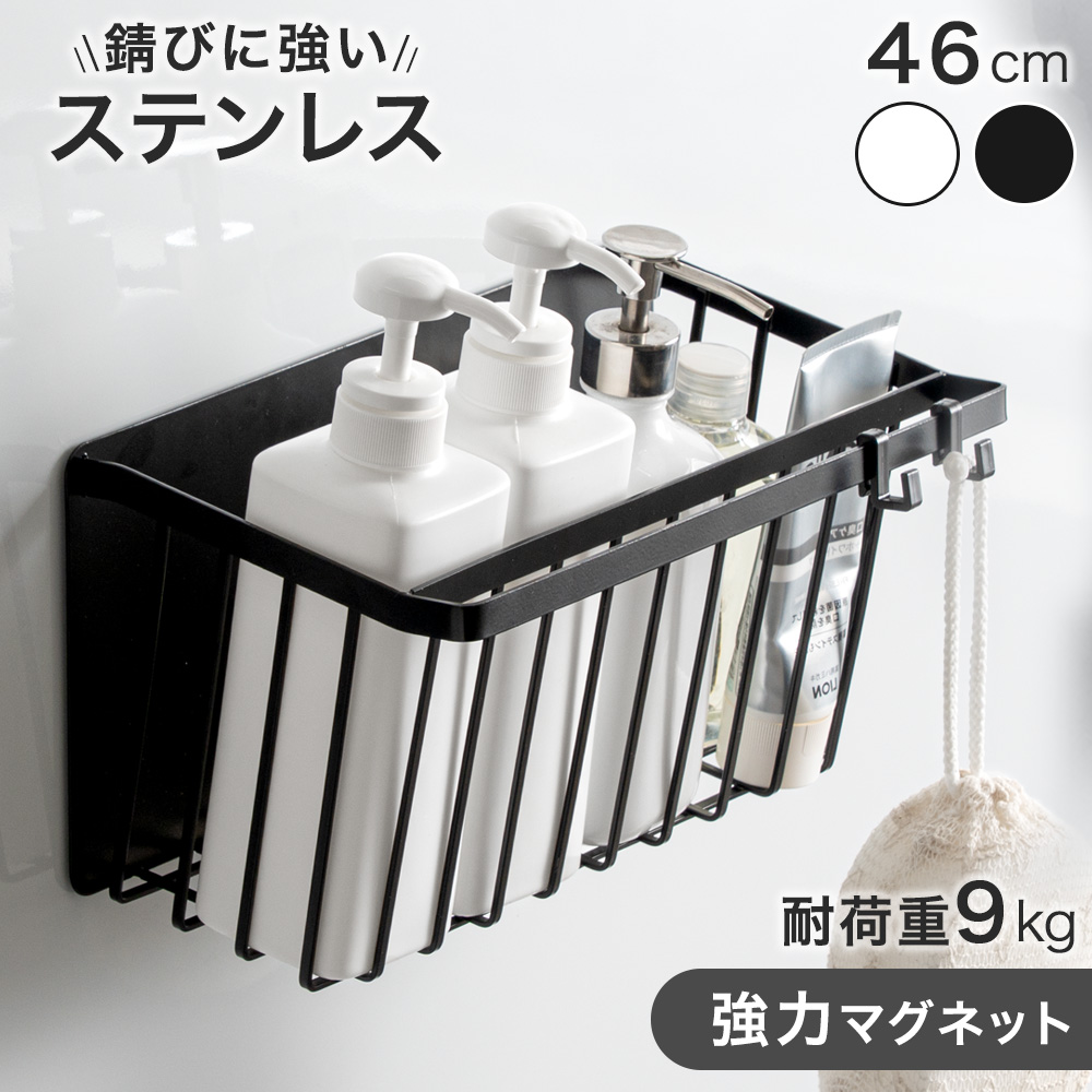 ステンレス製 マグネット 収納 ワイド バスラック カゴ 棚 お風呂 風呂 おふろ 浮かせる収納 おもちゃ入れ おもちゃバスケット シャンプーラック ブラック ホワイト フック 付き シンプル【商品番号:74100127】